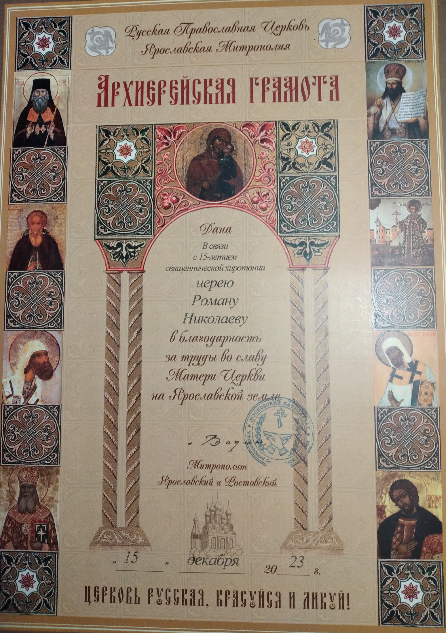 — иерею Роману Николаеву – в связи с 15-летием священнической хиротонии (Архиерейская грамота),