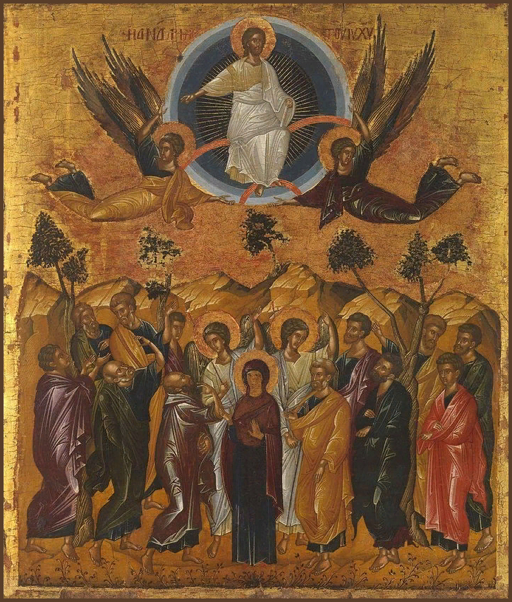 Согласно этим повествованиям, после Своего Воскресения из мертвых Спаситель неоднократно являлся ученикам, удостоверяя их в истинности Своего телесного Воскресения, укрепляя в них веру и подготавливая к принятию обетованного Св. Духа (ср.: Ин.16:7). Наконец, повелев не отлучаться из Иерусалима и ждать обещанного от Отца (Лк.24:49; Деян.1:4), Господь Иисус Христос вывел учеников из города в Вифанию, на гору Елеон (Деян.1:12), и, подняв Свои руки, подал им благословение, а затем стал отдаляться от них и возноситься на небо. В Деяниях св. апостолов описано, что, начав возноситься, Христос был сокрыт облаком, и тогда явились «два мужа в белой одежде», которые возвестили Его Второе пришествие. Ученики же поклонились Ему и с радостью вернулись в Иерусалим (Лк.24:52), где через несколько дней на них сошел Св. Дух (Деян.2:1-4).